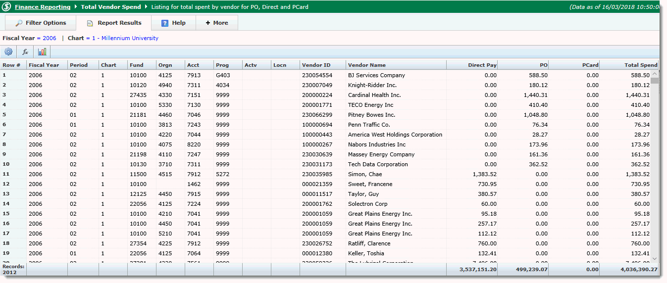 Use the Total Spend report to get a complete picture of the total spent with a vendor through direct pay, purchase orders, and purchasing card transactions (requires FAST PCard). You can select specific filter options including, Fiscal Year, Period, Chart, and Acct Type.