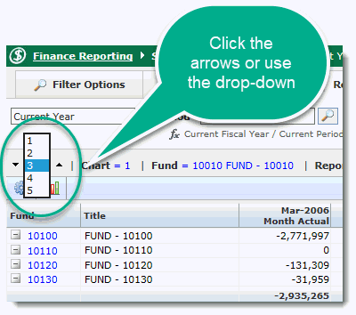 To traverse the levels within your Fund Structure, click the Fund Number (in blue) and/or you may change the level by selecting the Up/Down arrows or using the Level drop-down, as shown: