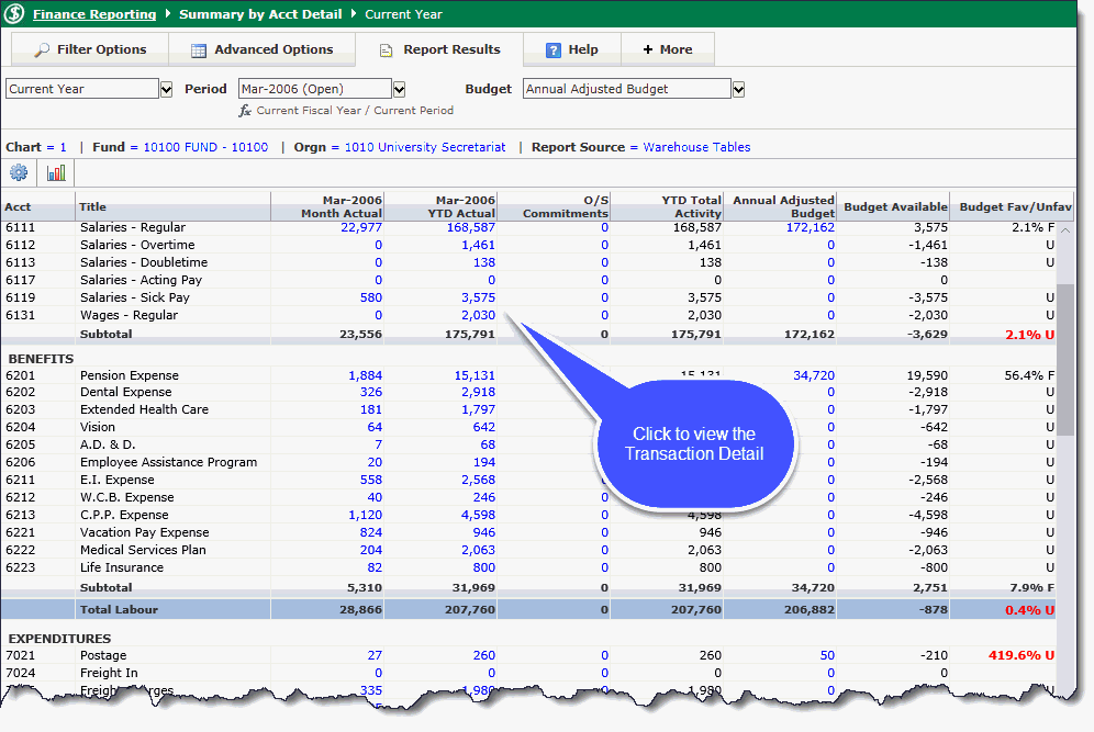 Drilling down on a specific Orgn (or DeptID) code will bring you through to the Summary by Acct Detail. This is also known as the Operating Statement and will list Accounts by Revenues, Labour, Benefits, Expenditures, Capital Expenses and Transfers. You will now notice that the amounts in the columns are links. Each of these link to a Transaction Detail Statement for that account.