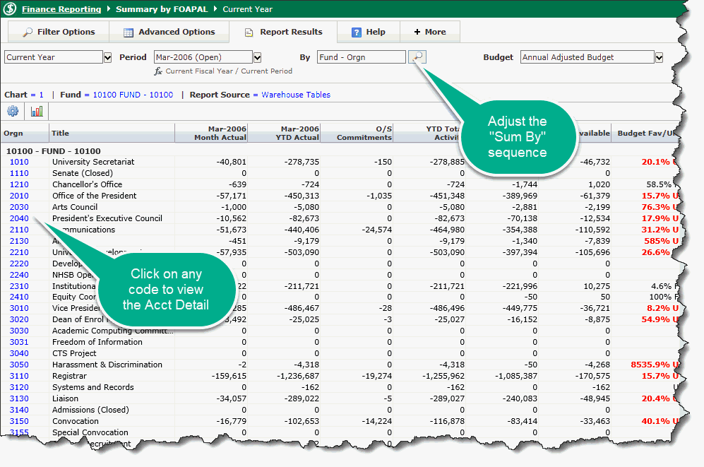Once you have drilled down to the final level, FAST will automatically take you to the Summary by GL Code (FOAPAL), which will list the codes that roll-up to that parent. The default display is Fund - Orgn (or in some cases, Fund - DeptID). You can adjust this view at any time.