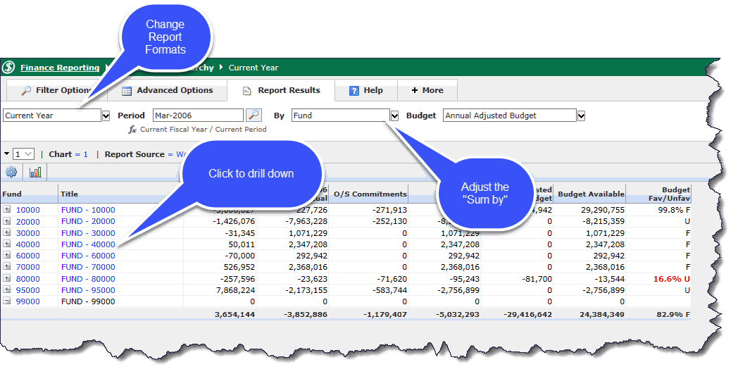These instructions are for the Operating Statement - Summary by Hierarchy using the Current Year format. Drilling down in other formats may be slightly different. In addition, your Chart of Accounts may be structured slightly differently than in the samples shown.
