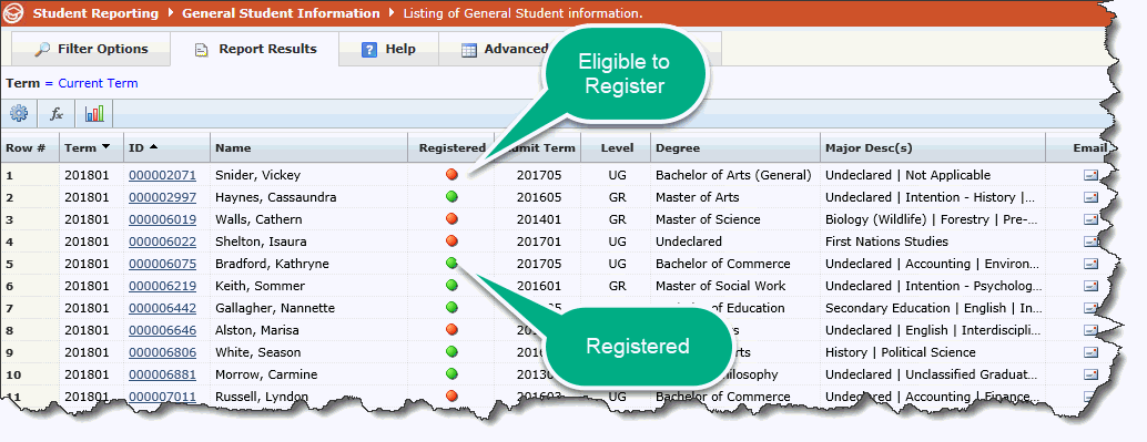 RED: If the Registered indicator is red, the student is not registered in the selected term, but is eligible to register, based on your institution's eligibility rules.